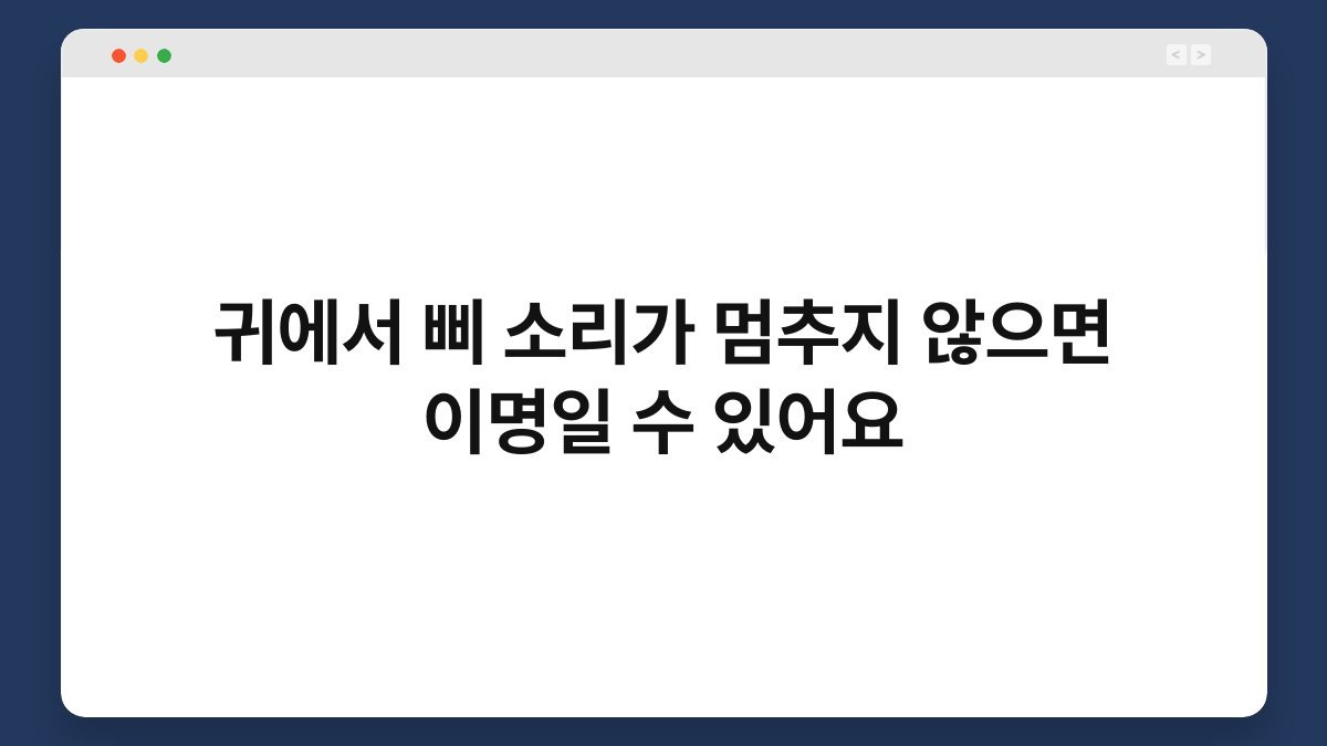 귀에서 삐 소리가 멈추지 않으면 이명일 수 있어요. 이명은 귀에서 소리가 들리는 현상으로, 외부 소음이 없는 상황에서도 지속적으로 소리가 느껴지는 것입니다. 많은 분들이 일상에서 귀에서 나는 소리를 무시하거나 단순한 피로로 치부하기도 합니다. 하지만 이명이 지속된다면 이는 단순한 증상이 아닌, 귀 건강에 대한 신호일 수 있습니다. 이 글을 통해 이명의 원인과 증상, 관리 방법, 그리고 예방 방법에 대해 알아보도록 하겠습니다. 이를 통해 귀 건강을 지키는 데 도움이 되실 것입니다.